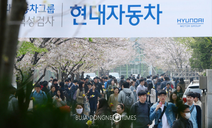 10일 오후 서울 송파구 신천동 잠실고등학교에서 현대자동차그룹 인적성검사(2016 상반기 HMAT) 시험을 마친 응시생들이 고사장을 나서고 있다. 2016.04.10.