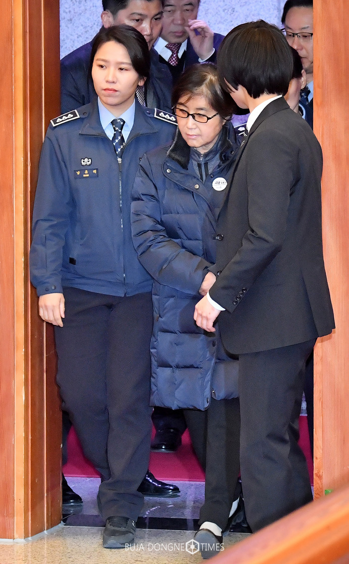 '비선실세' 최순실이 16일 오전 서울 종로구 헌법재판소에서 열린 박근혜 대통령 탄핵심판 5차 변론기일에 증인으로 출석하고 있다. 2017.01.16.