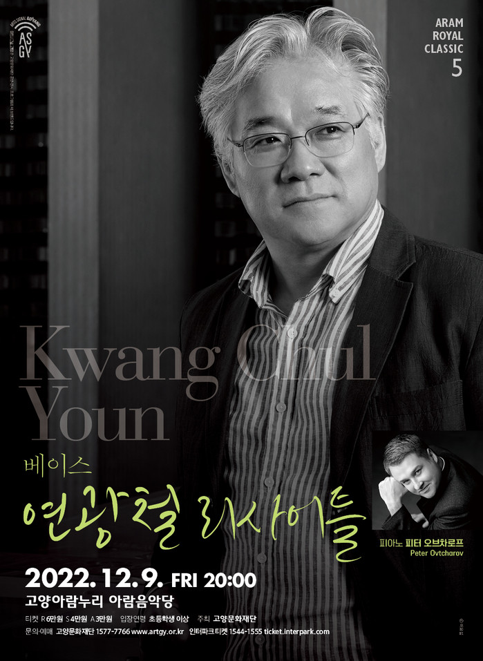 [부자동네타임즈 김인수기자] 고양문화재단(대표이사 정재왈)은 기획공연 시리즈 ‘2022 아람 로열 클래식’의 마지막 무대로 슈베르트, 슈만, 슈트라우스의 독일가곡과 우리말 가곡을 만날 수 있는 <베이스 연광철 리사이틀>을 오는 12월 9일(금) 오후 8시, 고양아람누리 아람음악당에서 개최한다. 그의 고양 무대는 지난 2012년 고양국제음악제 이후 정확히 10년 만이다.