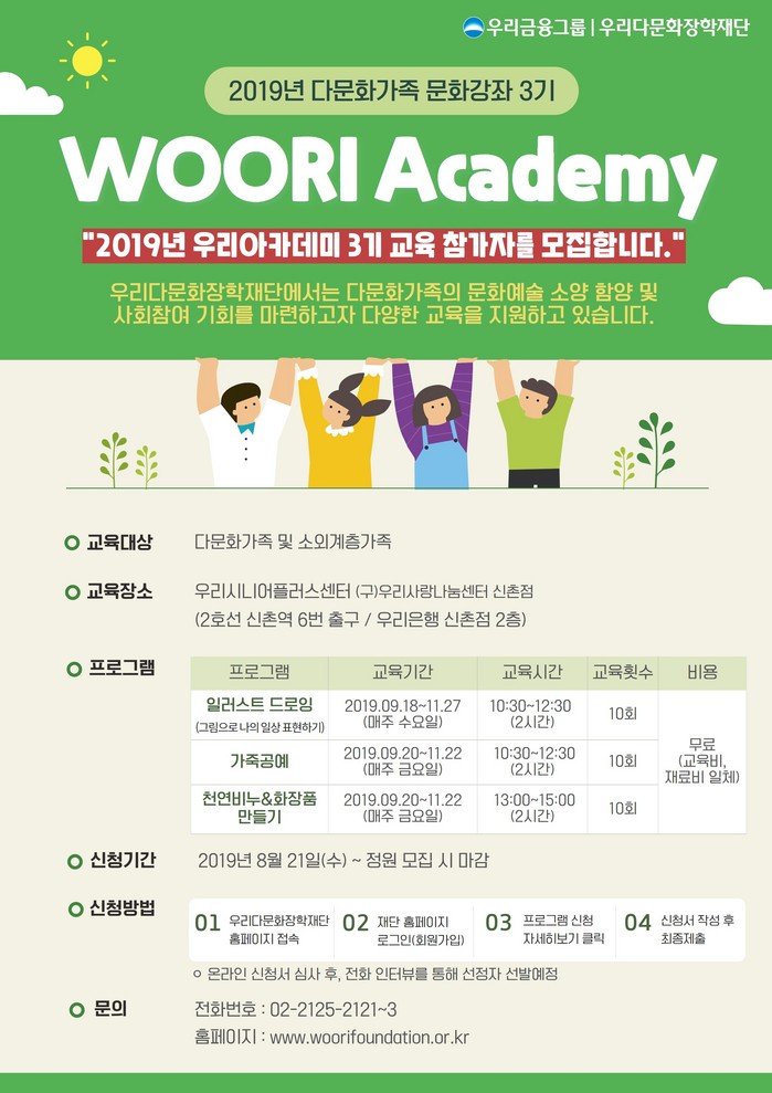 [부자동네타임즈 이현재 기자]우리금융그룹 우리다문화장학재단(이사장 손태승)은 결혼이민자 등 다문화가족을 위한 문화강좌인 ‘우리아카데미’ 2019년 3기 수업 참가자 모집을 지난 21일부터 실시하고 있다고 25일 밝혔다.