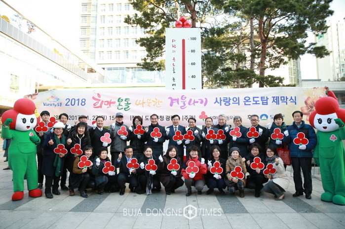 27일 구청 광장에서 ‘사랑의 온도탑’ 제막식을 개최하고 어려운 이웃들이 따뜻한 겨울을 보낼 수 있도록 ‘2018 희망온돌 따뜻한겨울나기’ 모금사업에 본격적으로 돌입하는 것.이날 행사에는 제막식뿐 아니라 동 지역사회보장협의체 위원장들의 도봉구 관내지도 퍼즐맞추기, 사랑의 열매달기, 기부자들의 성·금품 전달식 등도 이어지며 훈훈함을 더했다.