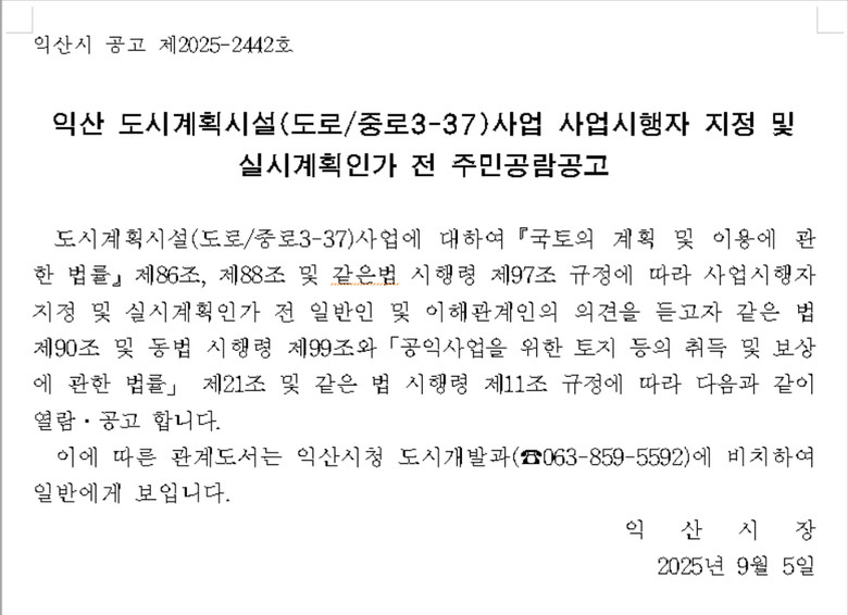 이에 대해 익산시 도시개발과 관계자에게 “농협에서 땅을 팔겠다는 의지가 없었는데 어떻게 승인이 났는지 확인 요청한 결과 도시계획 심의는 토지주의 허락이 없어도 된다는 답변이 돌아왔다. 현재 ”익산시 공고 제 2025-2442호 익산 도시계획시설(도로/중로3-37)사업 사업시행자 지정 및 실시계획인가 전 주민공람공고“ 익산시 홈페이지에 게시 중이다.