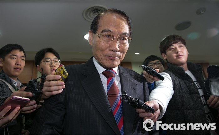 | △ 김만복 전 국정원장이 20일 오전 서울 여의도 새누리당사에서 열린 중앙윤리위원회 전체회의에 참석하며 취재진 질문에 답하고 있다. <사진제공=포커스뉴스> |