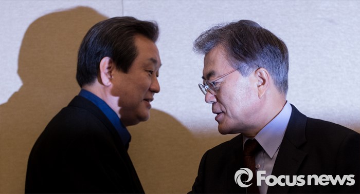 | △ 김무성(왼쪽) 새누리당 대표와 문재인 새정치민주연합 대표가 6일 오후 서울 여의도 국회에서 내년 20대 총선에 적용할 선거구 획정안 논의를 위해 만나 악수하고 있다. <사진제공=포커스뉴스> |