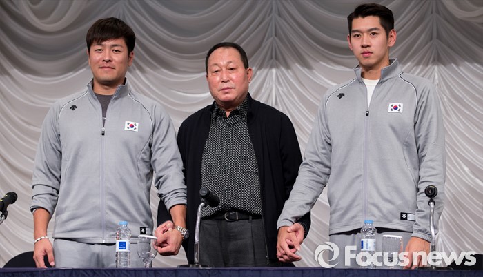 | △ 지난달 26일 오후 서울 금천구 시흥대로 바로가기노보텔 앰배서더 독산에서 열린 2015 WBSC 프리미어12 국가대표팀 공식 기자회견에서 강민호(왼쪽부터), 김인식 감독, 이대은이 기념촬영을 하고 있다. 김인철 기자 yatoya@focus.kr |