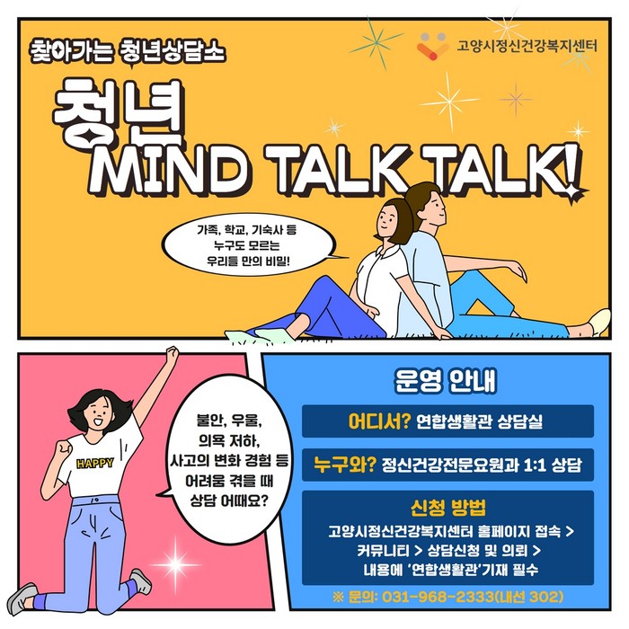 [부자동네타임즈 김인수기자] 고양시정신건강복지센터 청춘나래팀에서 올해 3월부터 11월까지 고양시 청년들의 정신건강을 위해 찾아가는 심리지원 서비스 ‘청년마인드톡톡’을 운영한다.