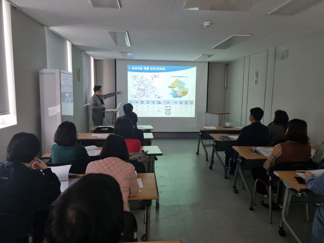 지역응급의료협의체와 연계해 전문강사로 초빙된 명지병원 권역응급의료센터장 김인병 교수와 일산소방서 김영주 소방위는 합동 교육에서 재난의료현장에서의 협의체 간 유기적 협조체계 구축과 상호간의 역할을 강조했다.