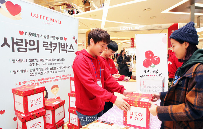 지난 11월 25일부터 26일까지 이틀간 진행된 ‘사랑의 럭키박스’는롯데몰 수원의 구매 고객이 행사 관계자에게 당일 영수증을 보여주고 기부금 2천원을 모금함에 넣으면, 무작위로 럭키박스를 증정하는 행사다. 럭키박스는 ▲ 영화 관람권 2매 ▲ 롯데몰 수원 기프트카드 1만원권 ▲ 경기도문화의전당 공연관람권 ▲ 쌀 2kg ▲ 라면세트 ▲ 빌리엔젤(롯데몰 수원 2층) 아메리카노 교환권 등으로 구성했고, 이 중 한 가지를 선물로 받게 된다. 롯데몰 수원은 이번 행사 기간에 총 600명의 기부 이벤트 참여자에게 럭키박스를 증정했다.