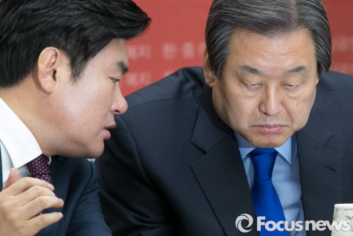 | △ 김무성(오른쪽) 새누리당 대표와 원유철 원내대표가 13일 오전 서울 여의도 국회에서 열린 주요당직자회의에 참석해 대화하고 있다. <사진제공=포커스뉴스> |