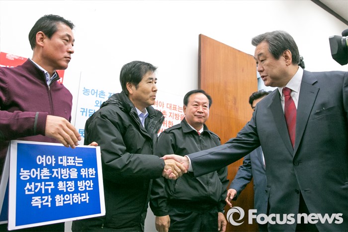 | △ 김무성(오른쪽) 새누리당 대표가 12일 오전 서울 여의도 국회 새누리당 대표최고위원실에서 점거농성 중인 농어촌 지방 주권 지키기 의원모임의 장윤석(왼쪽 두번째) 의원과 악수하고 있다. <사진제공=포커스뉴스> |