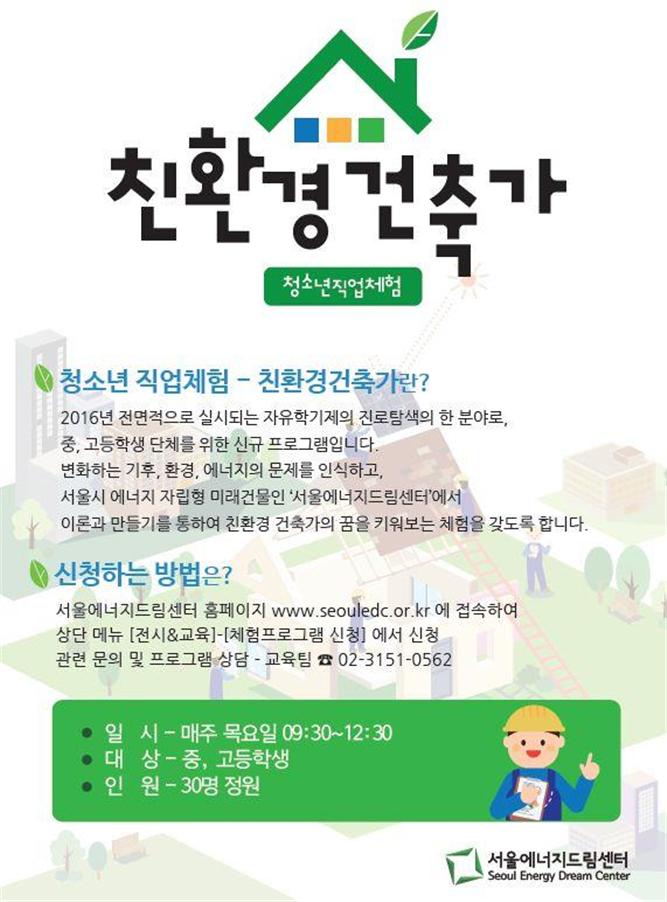 정희정 에너지시민협력과장은 “자유학기제가 전면 시행되는 시점에서 1회성으로 끝나는 흥미위주 프로그램이 아닌 청소년들이 꿈을 찾고 키워갈 수 있도록 지지하고 응원하는 좋은 프로그램이 요구되고 있다”면서 “많은 학생들이 공공기관 최초의 제로에너지 건물인 서울에너지드림센터에서 즐겁고 내실 있는 녹색직업체험 교육의 기회를 갖길 바란다”