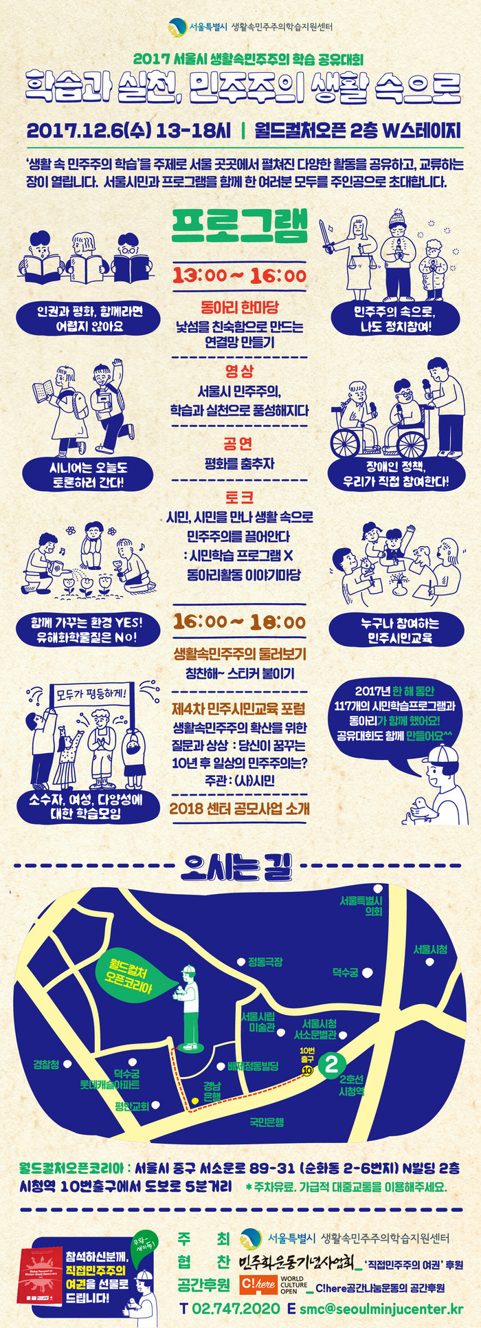 [부자동네타임즈 이병도 기자]서울시는 6일(수) 오후 1시부터 6시까지 월드컬쳐오픈 W스테이지 서소문에서 ‘2017 서울시 생활속민주주의 학습 공유대회’를 개최한다. ‘14년 전국 최초로 ‘민주시민교육에 관한 조례’ 제정한 후, 민주시민교육을 위한 공유대회는 지난해에 이어 이번이 두 번째다.