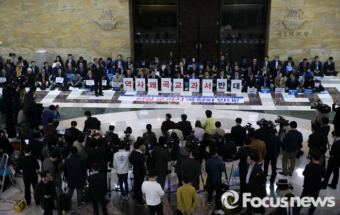 이날 새정치연합 의원 60여 명이 국회 로텐더 홀에 모인 가운데 문재인 대표는 "역사교과서 국정화 고시 강행은 행정절차를 무시한 불법행정"이라며 "다수 여론을 무시하고 행정절차를 위반한 불법행정을 강행하는 것이 독재 아닌가"라고 비판의 목소리를 높였다.