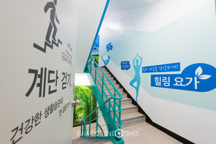 더불어 기존의 딱딱하고 무미건조한 구청사 계단을 층별로 재미있고 유익한 건강콘텐츠 그래픽을 제작·설치하였다. 계단 중간마다 산림욕 효과가 있는 피톤치드와 허브림 방향제도 설치되어 있다.