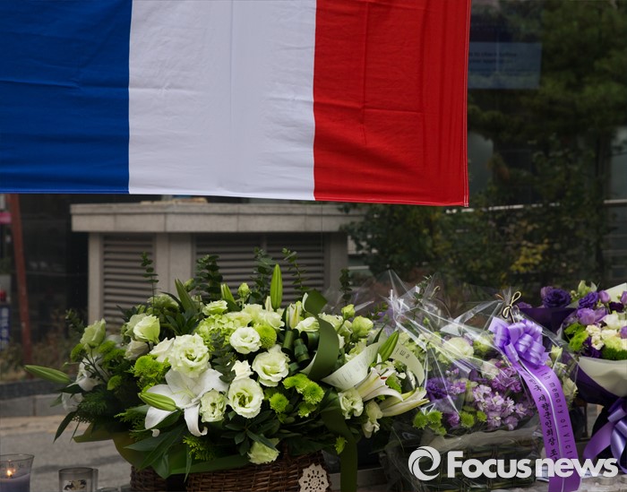 (서울=포커스뉴스) 16일 오전 서울 서소문로 주한 프랑스 대사관출입구에파리 테러 희생자를 추모하는 조화가 놓여 있다. 프랑스 파리에서 13일(현지시간) 밤부터, 14일 새벽까지 발생한 연쇄 테러로 인한 사망자는 129명을 넘었고, 부상자도 약 350여명인 것으로 알려지고 있다.