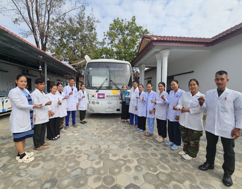 ▲사진설명 : 캄보디아의 시엠립 제4구역 군 병원에 한국의 대한결핵협회에서 기증한 버스가 있어서 병원 의사들과 함께 단체 기념촬영을 하고 있다. 사진 맨 안쪽 첫번째가 제나 정 글로벌외교관포럼 이사장이다.