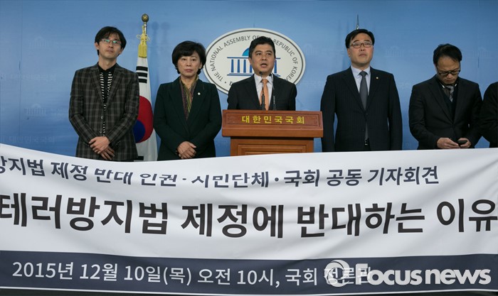 이들은 이날 오전 국회 정론관에서 기자회견을 가진 뒤 이같이 주장하며 김기식 의원이 대표로 "테러방지법은 국정원 강화법이라고 이름을 바꿔야 할 것 같다"고 목소리를 높였다.
