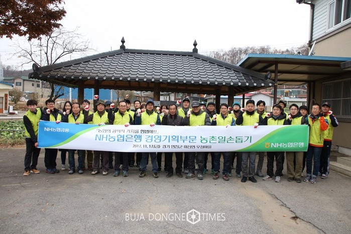 [부자동네타임즈 이현재 기자]NH농협은행은 경영기획부문 직원들로 구성된 농촌봉사단이 17일 수확철을 맞아 일손이 부족한 경기도 연천군 우정리 농가를 찾아 일손돕기를 실시했다고 밝혔다.