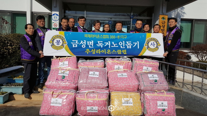 [부자동네타임즈 손권일 기자]담양 금성면은 26일 국제라이온스클럽355-B1지구 추성라이온스클럽(회장 염환구)에서 이불 20채(100만원 상당) 기탁과 함께 독거노인 등 어려운 이웃을 찾아 위문 활동을 펼쳐 훈훈한 신년 분위기를 조성했다고 전했다.