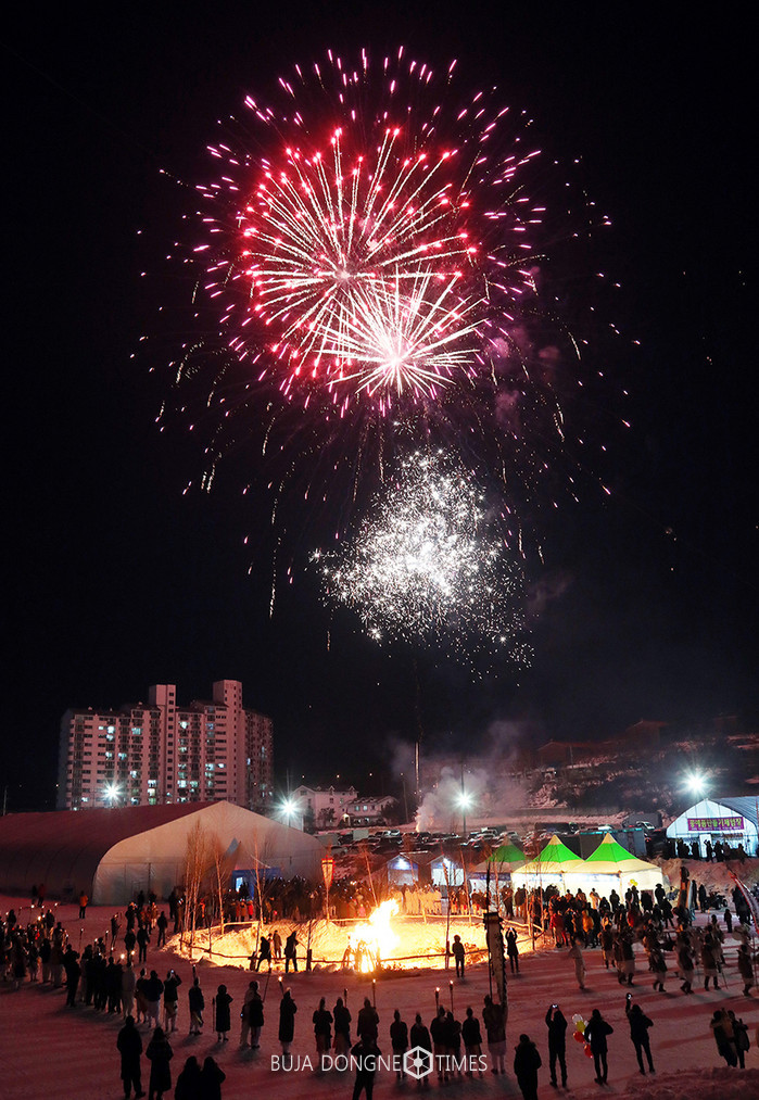 지난 3일 오후 강원도 대관령면 횡계리 송천일대에서 열린 평창윈터페스티벌의 대관령눈꽃축제 개막식에서 화려한 불꽃놀이가 펼쳐지고 있다. 2018 평창동계올림픽을 1년여 앞두고 열리는 제 25회 대관령눈꽃축제는 ‘우리는 겨울에 올림픽 개최도시 평창으로 간다’라는 슬로건아래 대형 오륜기 모형의 눈과 얼음조각을 비롯 눈썰매와 얼음썰매 등 겨울놀이 광장이 야간에도 운영된다. 특히 평창의 전통문화의 역동성을 선보이는 윈터퍼레이드, 국제알몸마라톤대회, 주민들이 참여하는 전통눈썰매 대회인 눈나라운동회, 눈꽃가요제 등 12일까지 열린다. 2017.02.04. (사진=평창군 제공)