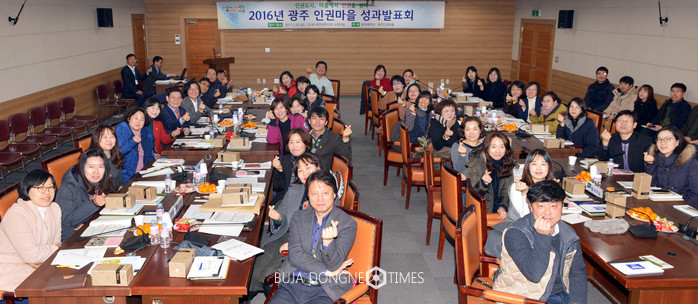 광주광역시는 20일 시청 3층 소회의실에서 '2016년 광주 인권마을 성과발표회'를 열고, 지난해 인권마을 사업 성과를 공유하고 향후 인권마을사업 방향을 논의했다.