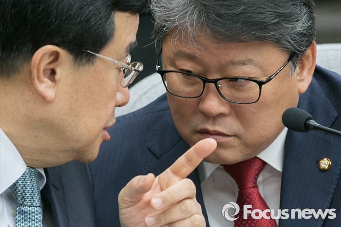 | △ 김정훈(왼쪽) 새누리당 정책위의장과 조원진 원내수석부대표가 13일 오전 서울 여의도 국회에서 열린 주요당직자회의에 참석해 대화하고 있다. <사진제공=포커스뉴스> |