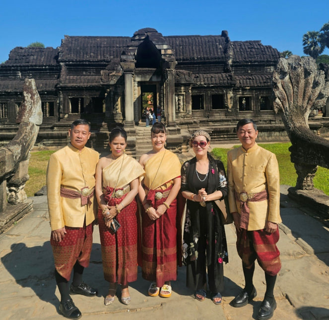 ▲사진 설명| 한-인도 비즈니스문화진흥원 (IKBCC: Indo-Korea Business Culture Center)과 글로벌외교관포럼(Global Diplomats Forum)의 제나 정(Dr. Zena Chung) 이사장이 캄보디아 시엠립의 앙코르 와트 사원을 방문해, 전 세계가 하나의 지구 공동체이자 하나의 가족임을 뜻하는 ‘바수 데이바(Vasudhaiva Kutumbakam)’의 정신을 담아 두 손으로 하트 모양을 만들고 인류애를 향한 사랑을 전하고 있다.