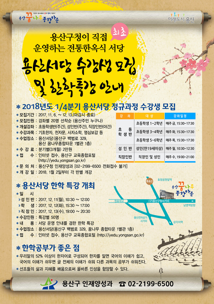 용산구(구청장 성장현)가 원효로 옛 구청사 별관에 용산서당을 조성하고 내달 15일까지 2018년도 1/4분기 수강생을 모집한다.