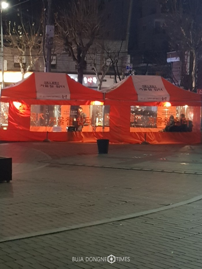 [부자동네타임즈 이병도 기자]중랑구(구청장 나진구)는 연일 계속되는 한파와 건설경기 침체로 어려움을 겪고 있는 건설 일용근로자들을 위해, 오는 3월 말까지 면목역 광장에 천막과 난로가 있는‘겨울철 쉼터’를 운영 중이다.