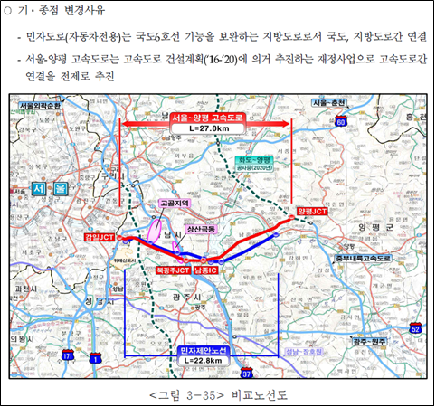 정부는 ①국도6호선 교통정체 완화 ②서울시-양평군 간 접근성 향상 등의 목적을 고려해 이 민자사업을 ‘재정사업’으로 전환하고, 상위 도로계획에 따라 고속도로 간 연결을 전제로 하는 양서면 종점안을 새로 마련했다. 당초 국도6호선으로 직결하기 위해 종점을 양서면 도곡리로 설정했었으나, 이보다 더 연장해 양서면의 화도-양평 고속도로에 붙이기로 결정한 것이다.
