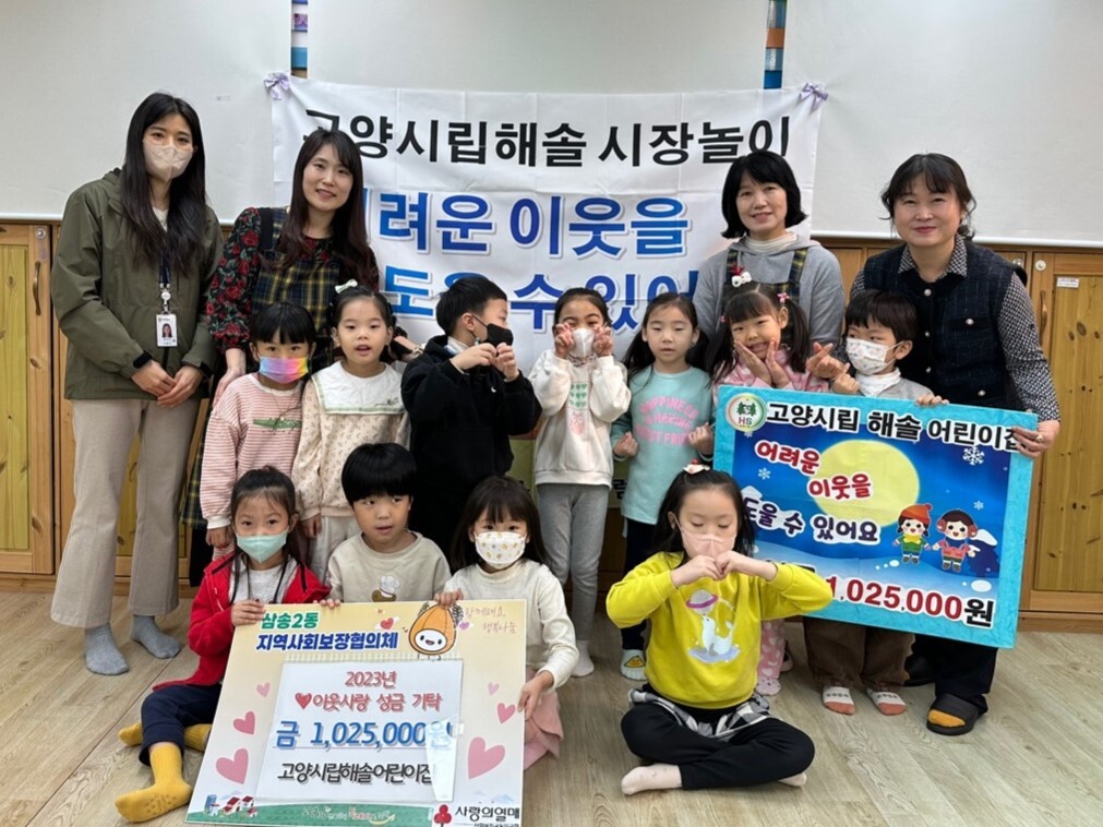 이번에 기탁한 성금은 고양시립해솔어린이집의 겨울맞이 특별 교육 과정인 ‘고양시립해솔 시장놀이’를 통해 모아졌다. 직원들이 어린이집 내에 적절한 공간을 활용해 영화관, 야채 및 과일상점, 음식점 등 다양한 테마의 부스를 꾸미고, 원아들은 쿠폰을 가지고 자율적으로 원하는 상품이나 서비스를 구매하는 방식으로 운영했다.