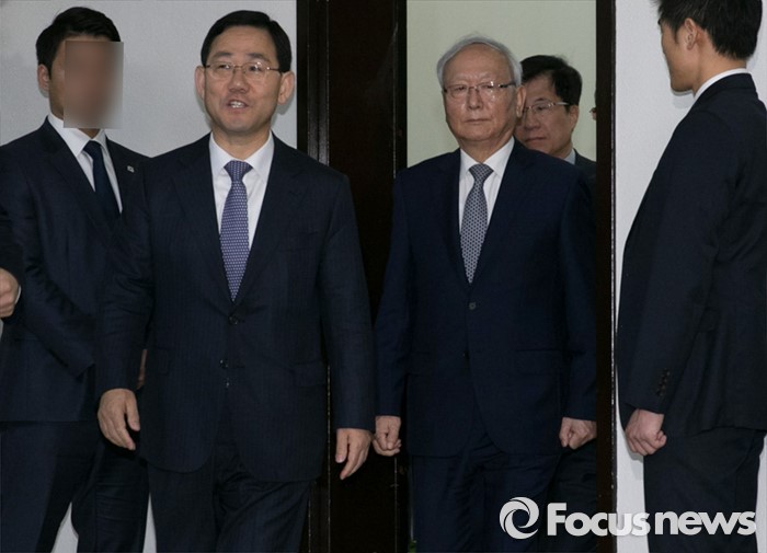 | △ 18일 오전 서울 여의도 국회에서 열린 정보위원회 파리 테러사태 관련 현안보고에 앞서 주호영 위원장과 이병호 국가정보원장이 회의실로 이동하고 있다. <사진제공=포커스뉴스> |