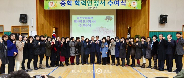 | △장휘국 광주시교육감은 '2016학년도 중학교 학력인정서 수여식'에 참석, 졸업생 22명에게 학력인정서를 수여하고 존경의 마음을 담은 격려와 축하 인사를 하고 기념촬영을 하고 있다 |
