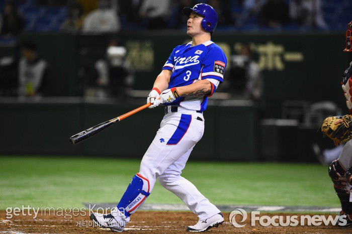 | △ <도쿄/일본=게티/포커스뉴스> 한국야구대표팀 박병호가 지난달 21일 일본 도쿄돔에서 열린 미국과의 프리미어12 결승전에서 4-0이던 4회초 3점 홈런을 때려낸 뒤 타구를 지켜보고 있다. ⓒ게티이미지/멀티비츠 photo@focus.kr |
