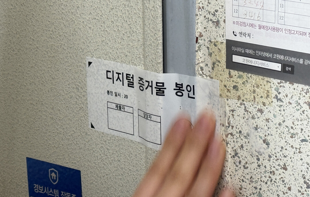 [부자동네타임즈 = 이현재 기자] 3대 특별검사 이후 남은 의혹들을 수사하는 2차 종합특검팀 관계자들이 16일 '관저 이전 의혹'을 받는 국민의힘 윤한홍 의원의 서울 강남구 자택 압수수색에 나서 출입문에 디지털 증거물 봉인지를 부착하고 있다. 2026.3.16