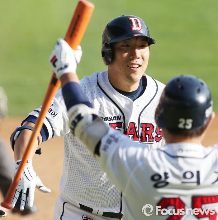 (서울=포커스뉴스) 4일 잠실구장에서 열린 2015 프로야구 KIA-두산 경기에서 두산 김현수가 6회말 1사 1,2루에서 우월 3점 홈런을 치고 양의지의 환영을 받으며 홈인하고 있다.