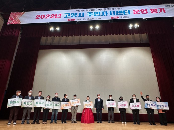 [부자동네타임즈 김인수기자] 고양특례시(시장 이동환)가 지난 11월 25일 시청 문예회관에서 ‘2022년 고양시 주민자치센터 운영평가 및 시상식’을 실시했다. 이날 14개 동 주민자치회가 수상했다.