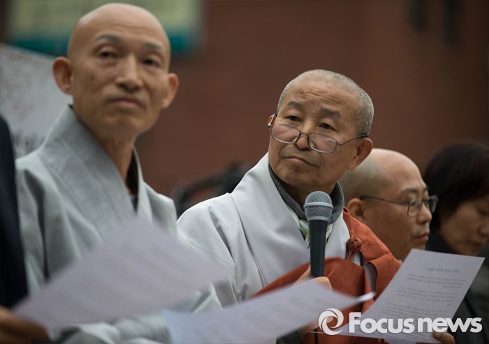 | △ 지난 19일 오후 서울 종로구 조계사에서 조계종 화쟁위원회 위원장 도법 스님이 한상균 민주노총 위원장 신변보호 요청에 대한 화쟁위 회의 결과 발표에서 기자의 질문을 경청하고 있다. <사진제공=포커스뉴스> |