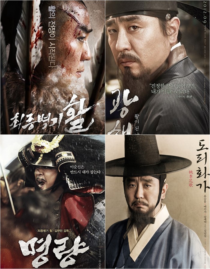 | △ 배우 류승룡이 영화 '도리화가'에서 소리꾼 신재효 역을 맡아 4번째 사극 연기에 도전한다. 사진은 그가 출연한 '최종병기 활', '광해', 도리화가', '명량'(좌측 상단부터 시계순서대로) <사진제공=해당 영화 캐릭터 포스터> |