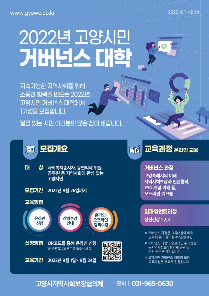 [부자동네타임즈 김인수기자] 고양시지역사회보장협의체가 지역사회에 관심이 많은 고양시민을 대상으로 9월 1일(목)부터 9월 24일(토)까지 고양시민 거버넌스 대학을 운영한다.