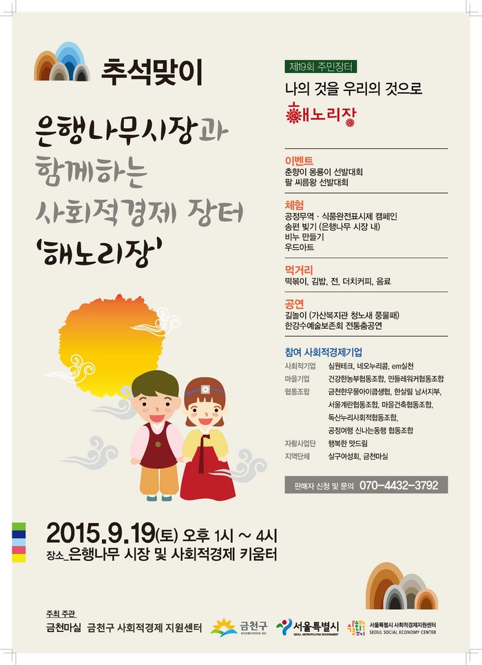 은행나무 시장에서는 사회적경제 홍보 부스를 운영해 시장을 찾는 주민들을 대상으로 사회적경제 제품 및 서비스를 홍보하고 사회적경제 장터가 열리는 해노리장 참여를 유도할 예정이다.