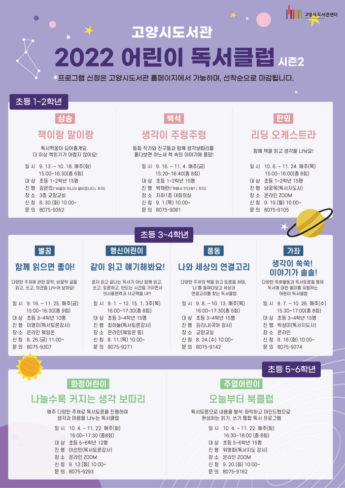 [부자동네타임즈 김인수기자] 고양특례시(시장 이동환) 도서관에서 오는 9월부터 2022 어린이 독서클럽 시즌2을 운영한다. 올 4월부터 진행된 시즌1에 이어 9개 시립도서관에서 학년별로 다양한 주제의 독서클럽이 진행될 예정이다.