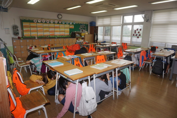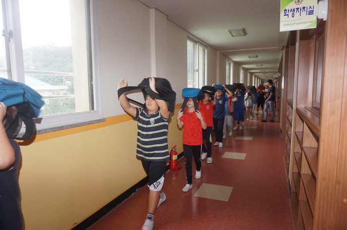 하성초에서는 예행연습 없이 전문강사의 지진 국민행동요령교육 실시 후 상황발생을 가정하여 안전지대(운동장)로 대피훈련을 실시하며 유사시 경주와 같은 지진 발생시 내몸을 먼저 보호하고 대피하는 요령을 체득했다.
