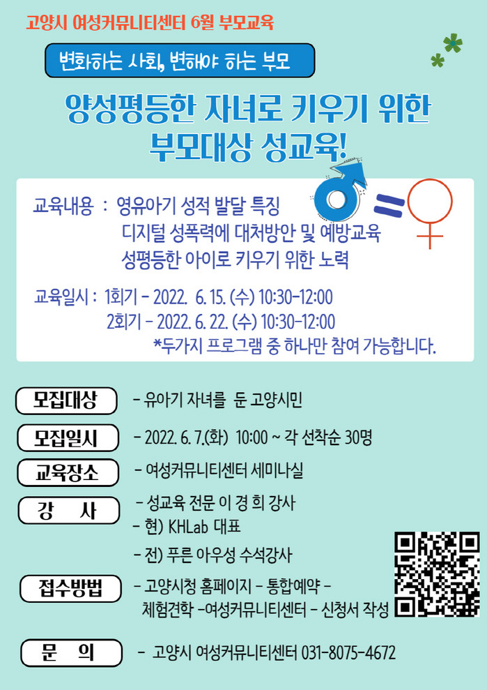 [부자동네타임즈 김인수기자] 고양시 여성커뮤니티센터에서 6월 15일(수)과 22일(수) 2회에 걸쳐 ‘양성 평등한 자녀로 키우기 위한 부모대상 성교육’을 진행한다.