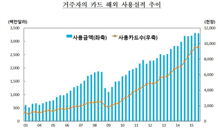 18일 한국은행이 발표한 '2015년 3분기중 거주자의 카드 해외 사용실적'에 따르면 3분기 중 내국인(거주자)이 해외에서 사용한 카드금액은 33억달러로 전분기(33억2000만달러)보다 소폭 줄었다.