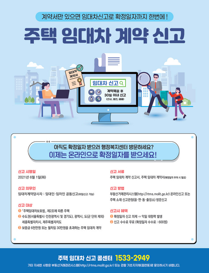 신고는 계약 대상 주택 관할 소재 행정복지센터에 방문하거나 부동산거래관리시스템을 통해 온라인으로도 신고가 가능하다.