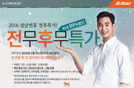 제주항공에 따르면 19일부터 30일까지 제주항공 홈페이지와 모바일 앱과 웹 등 온라인을 통해서만 판매하며 탑승기간은 2016년 2월1일부터 29일(국내선은 설 연휴 성수기인 2월 6∼11일, 국제선은 2월 5∼10일 제외)까지다.