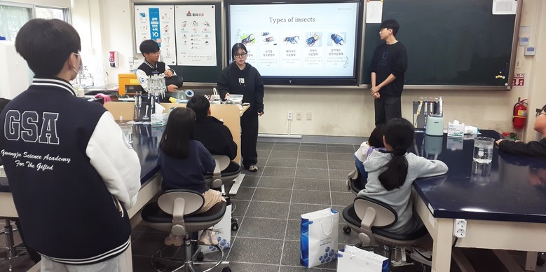 ▲ 광주과학고 재학생들이 지난 4일 교내 실험실에서 초등학생들에게 곤충의 생태적 특징과 종류에 대해 설명하고 있다. /광주시교육청 제공