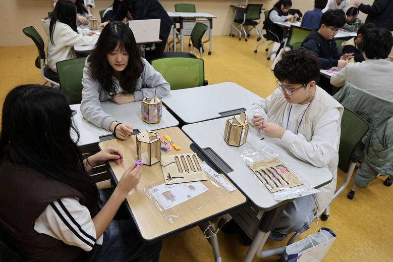 ▲ 광주과학고 재학생들과 초등학생들이 지난 4일 교내 실습실에서 스트링 아트 기법을 활용해 기하학적 구조의 다면체를 함께 만들고 있다. /광주시교육청 제공