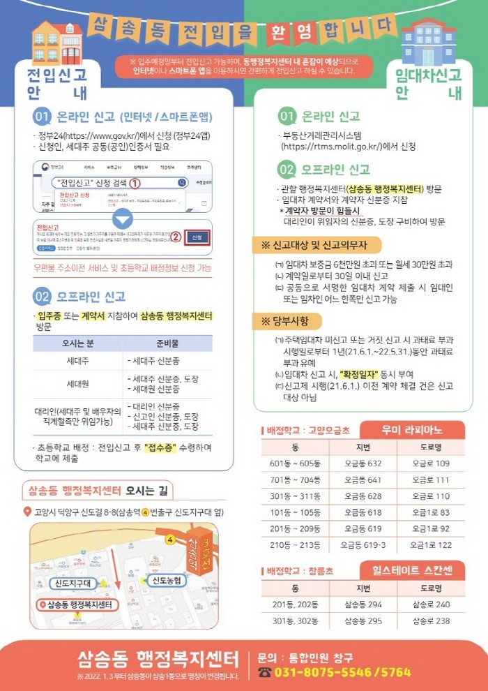 [부자동네타임즈 김인수기자] 고양시 덕양구 삼송동 행정복지센터(동장 김동원)가 지난 27일, 대규모 신규택지 입주를 앞두고 원활한 민원처리와 입주민의 편의 도모를 위해 전입신고 안내문을 제작·배포했다고 밝혔다.